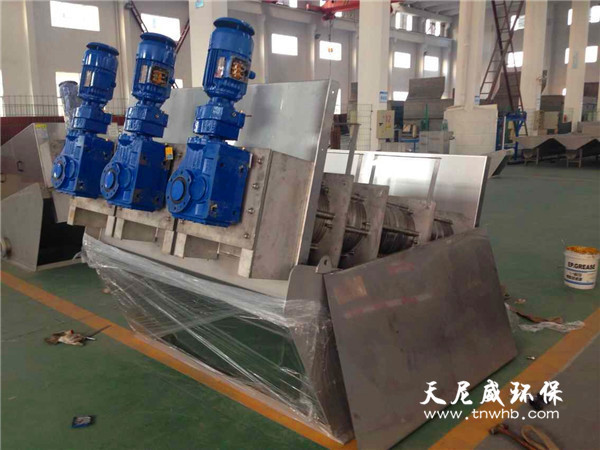 2)脫水:經過濃縮的污泥隨著螺旋軸的轉動不斷往前移動;沿泥餅出口方向,螺旋軸的螺距逐漸變小,環與環之間的間隙也逐漸變小,螺旋腔的體積不斷收縮;在出口處背壓板的作用下,內壓逐漸增強,在螺旋推動軸依次連續運轉推動下,污泥中的水分受擠壓排出,濾餅含固量不斷升高,最終實現污泥的連續脫水。